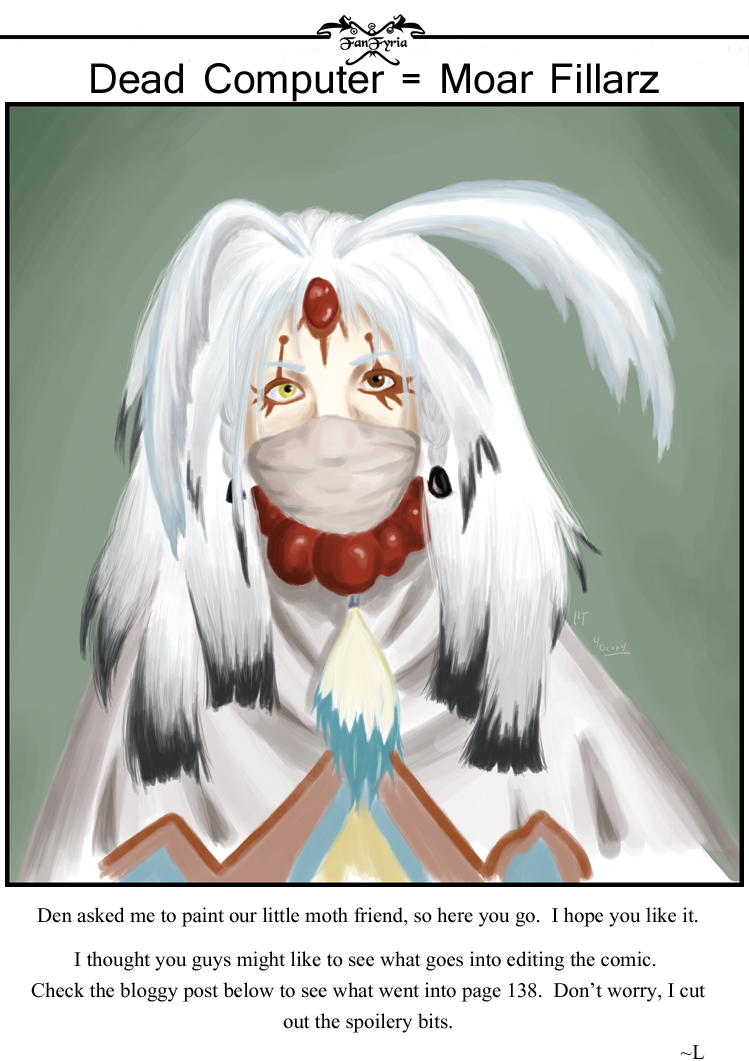 Denny: SO hmmm. The big bubble should be “The wind element, she governs inspiration and memories, some call her Erio.” …but not souding so bad >>; Denny should ask “but it was corrupted?” but now I think “governs memories?” seems like more right thing to ask. And the last panel … I`m not too sure what to have as dialogue here now =_=;