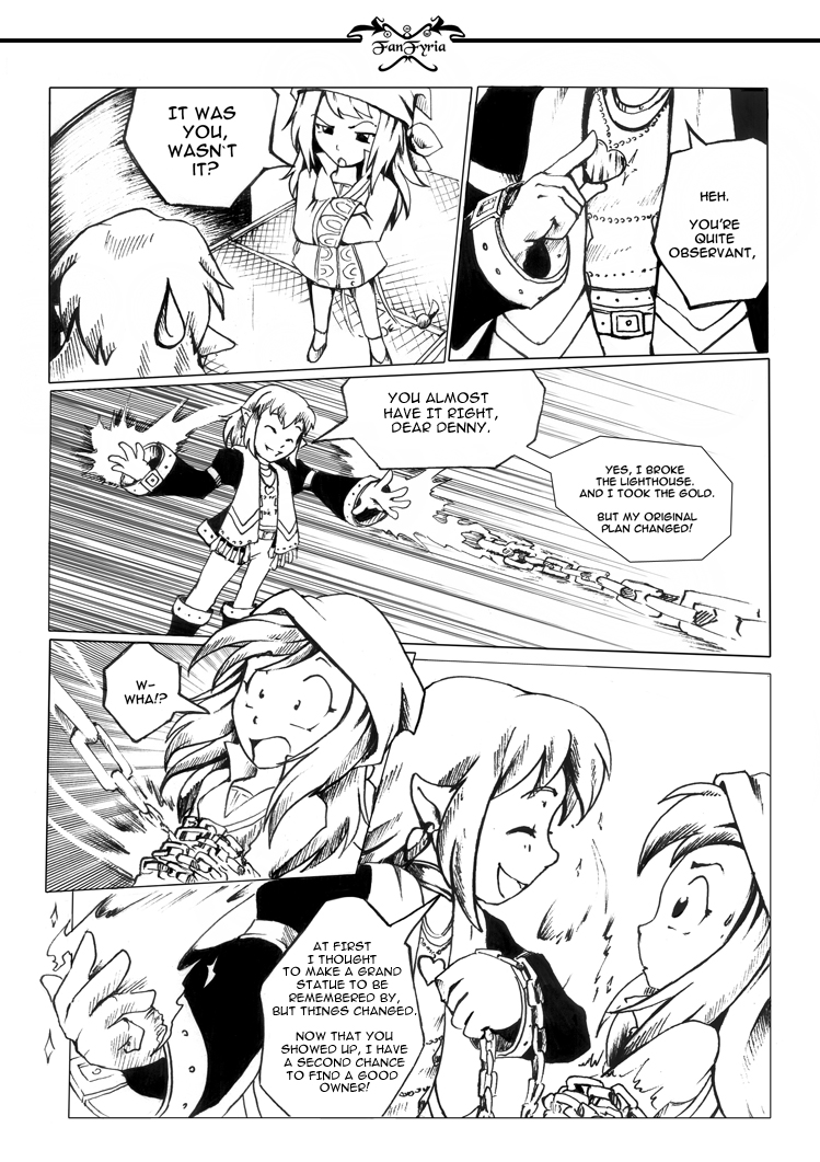 I love the expressions in the last panel. Xavier’s all :D and Denny’s all ‘Um…you crazy…’ I love Xavier even more for the fact that even tying people up he looks so darn happy! I can’t stop smiling now! Great page! Now let’s see what Grumpy Guy-if I don’t find out his name I’m going to start calling him Calvin ’cause he looks like a Calvin or Kevin-does.