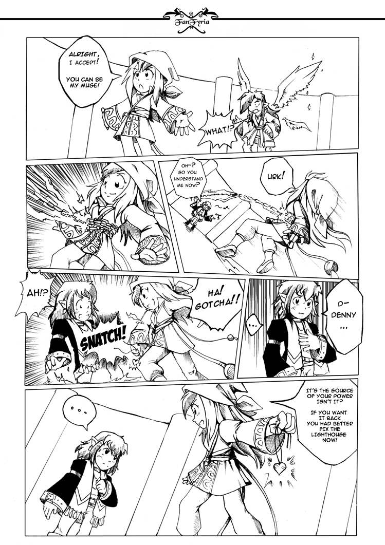 Denny : i thought of another way to fix it : you can change pannel 4 to make Denny use her left hand instead of the right one. Better : that will make her in same pose she is in last panel. Her left hand should draw an “outer” circle to catch the necklace, where here her right hand drew an “inner” circle. I’m not sure if i’m understood, my english is not good enough to explain this. :-°